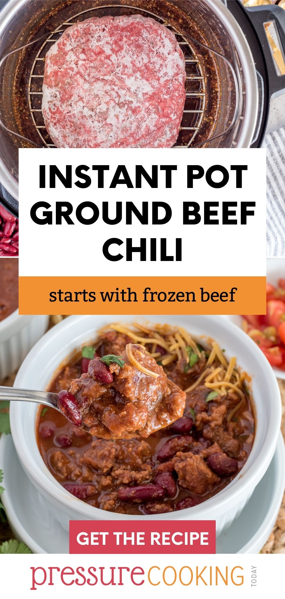 This easy Frozen Ground Beef Chili recipe will work in any brand of electric pressure cooker, including the Instant Pot, Ninja Foodi, or Power Pressure Cooker XL.