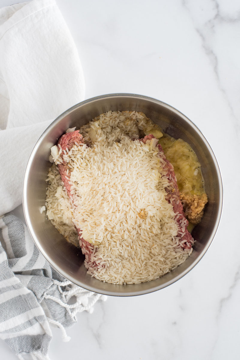 For the filling, in a large bowl, beat the egg, then stir in the onion, garlic, salt, pepper and cooked rice. Add the ground beef and pork and mix with a wooden spoon or your hands until all the ingredients are well combined.
