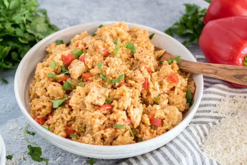 Spanish-Style Instant Pot Chicken and Rice is a healthy and easy one-pot meal with lean chicken breasts, red bell pepper, and fluffy rice spiced with paprika and cumin.