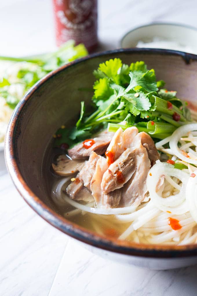 After you’ve separated your chicken from the bone and strained your broth, it’s time to assemble your soup. Start by layering the softened rice noodles with your chicken and vegetables. Then, pour the steaming broth over top and add in some sriracha, hoisin sauce, more fish sauce, red chili paste or pepper flakes, and enjoy!