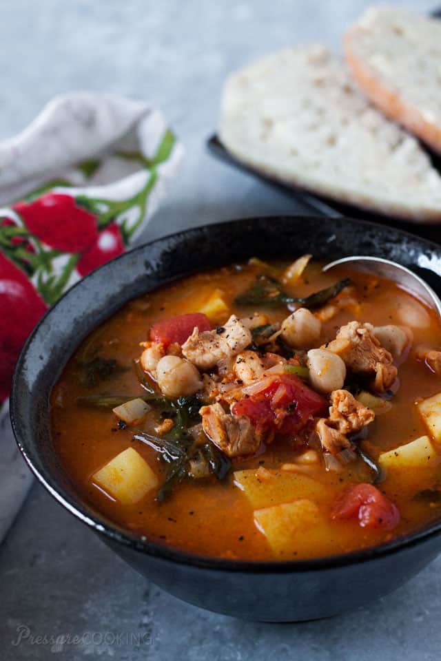 This Pressure Cooker Chorizo, Chicken and Kale Soup is a spicy soup loaded with good for you ingredients, garbanzo beans, tomatoes, and kale.