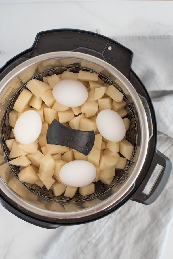 Place the peeled and diced potatoes in a steamer basket in the pressure cooking pot, then gently nestle the eggs on top. (No need to crack them, just take them from the carton to on top of the potatoes.)