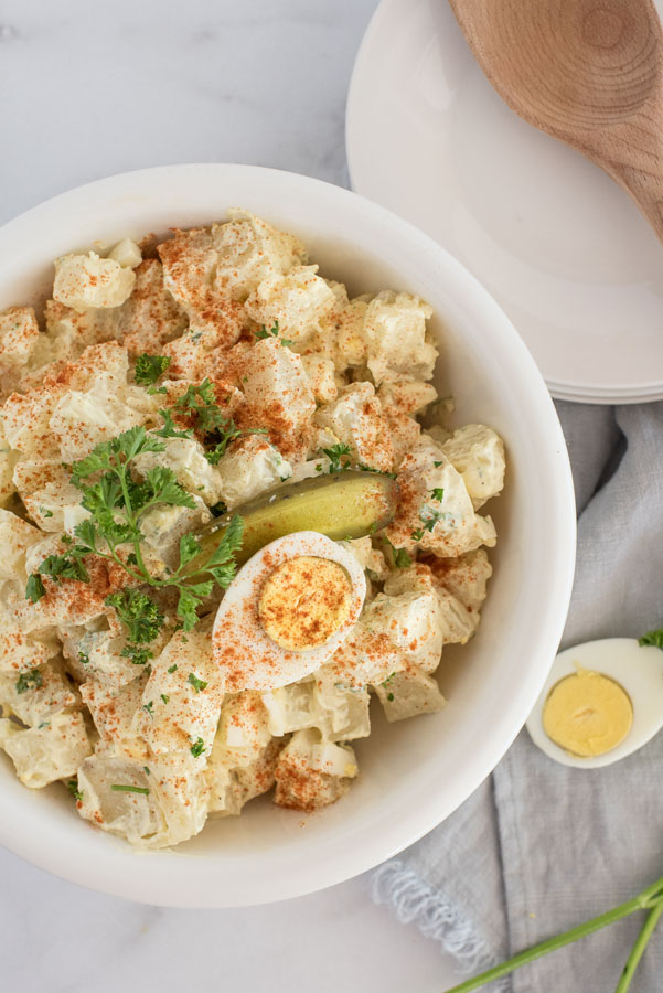 My dressing is a traditional potato salad recipe, based on how my mom made hers. Fresh parsley adds freshness and a bit of green to the dish, while pickle juice is the secret to zippy, tangy potato salad dressing. I usually go with French’s yellow mustard for the most classic flavor.