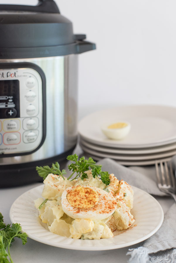 My favorite part about this pressure cooker potato salad is that you can cook the potatoes and hard boil the eggs at the same time!