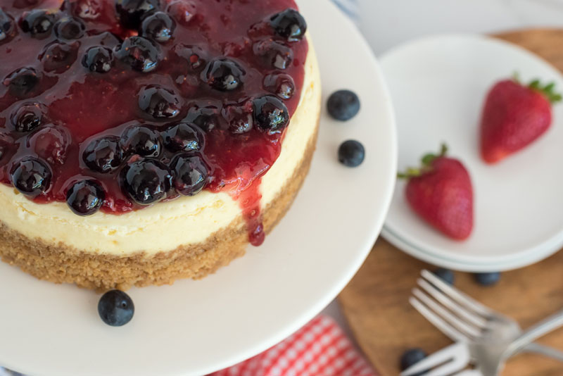 This cheesecake is topped with a rich strawberry-blueberry compote. It’s a simple, easy recipe that tastes decadent and amazing!