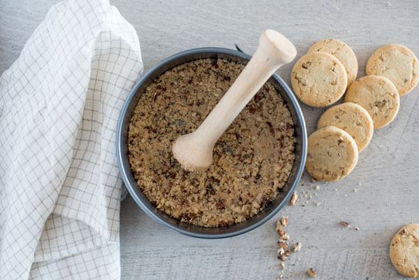 - In a small bowl, combine the cookie crumbs, chopped pecans, and butter. Press the mixture evenly into the bottom and about an inch up the side of the prepared pan. Place in the freezer for 10 minutes..