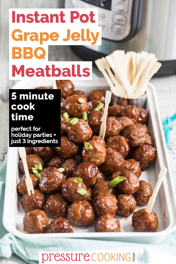 These Pressure Cooker / Instant Pot Meatballs cook from frozen and are coated in a sweet and tangy sauce made with BBQ sauce and grape jelly. An easy appetizer with just 3 ingredients and a 5 minute cook time!