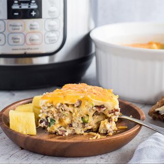 Thank you so much for this recipe. It is delicious. Very versatile. I added diced green and red peppers and only used ham. I used almond milk instead of regular milk. Cooking time is right on, but I did not let this set for an extra 10 minutes. I did a quick release right after the 30 minute time had elapsed. It was cooked perfectly. It does have a bit of water standing on top which I sucked up with a paper towel, then put in oven on broil for a few minutes to brown. I am so pleased with this recipe I will try more of yours for sure!