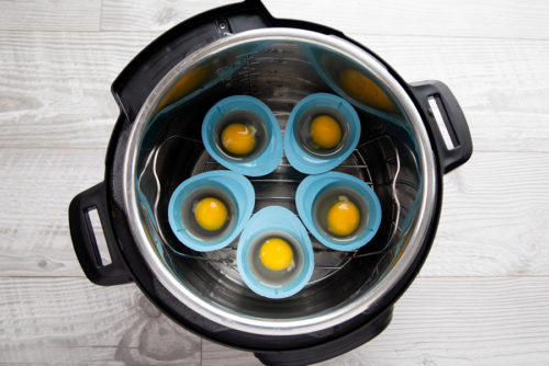 Generously spray the silicone egg cups with nonstick cooking spray. Crack 1 egg into each silicone egg cup. Place a trivet in the bottom of the pressure cooking pot, then add 1 cup cool water. Balance the filled egg cups on top of the trivet. Set the cook time for 5 minutes, then use a quick pressure release. Immediately transfer the poached eggs to a wire rack to cool.
