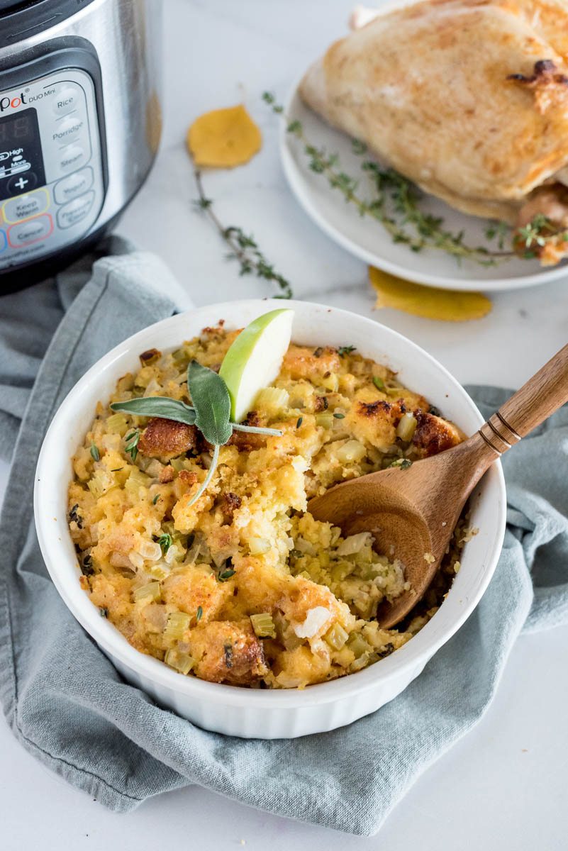 Instant Pot Cornbread Dressing is a sweet and savory Thanksgiving side dish with crisp apples, crunchy celery and plenty of fresh herbs.