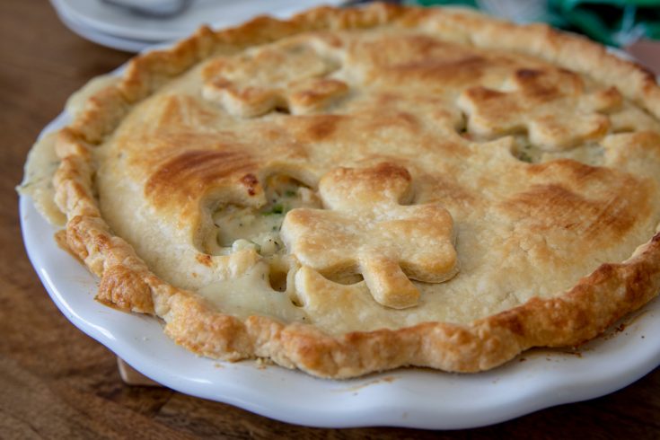 My family loves chicken pot pie for dinner! Growing up, it was always on our St. Patrick’s Day menu, decorated with shamrock pie crust cut-outs.