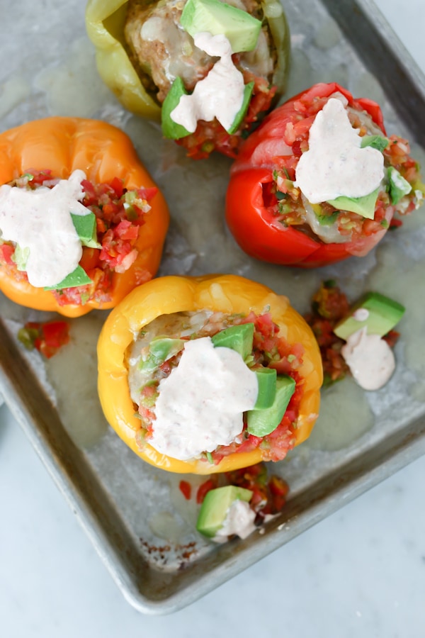 So comin’ at ya today is a juicy turkey stuffed bell pepper recipe. The stuffed peppers are topped with pepper jack cheese and all the best Mexican staples, and then drizzled (preferably smothered) in a perfectly spicy chipotle lime sauce. If you have several smother-ers in your party, you may want to double the sauce recipe. And if tortilla chips are a must for you when it comes to Mexican food, take a big handful, crush lightly in your hand, and let it snow all over your colorful plate of delicious food. You’ll be glad you did, I promise!