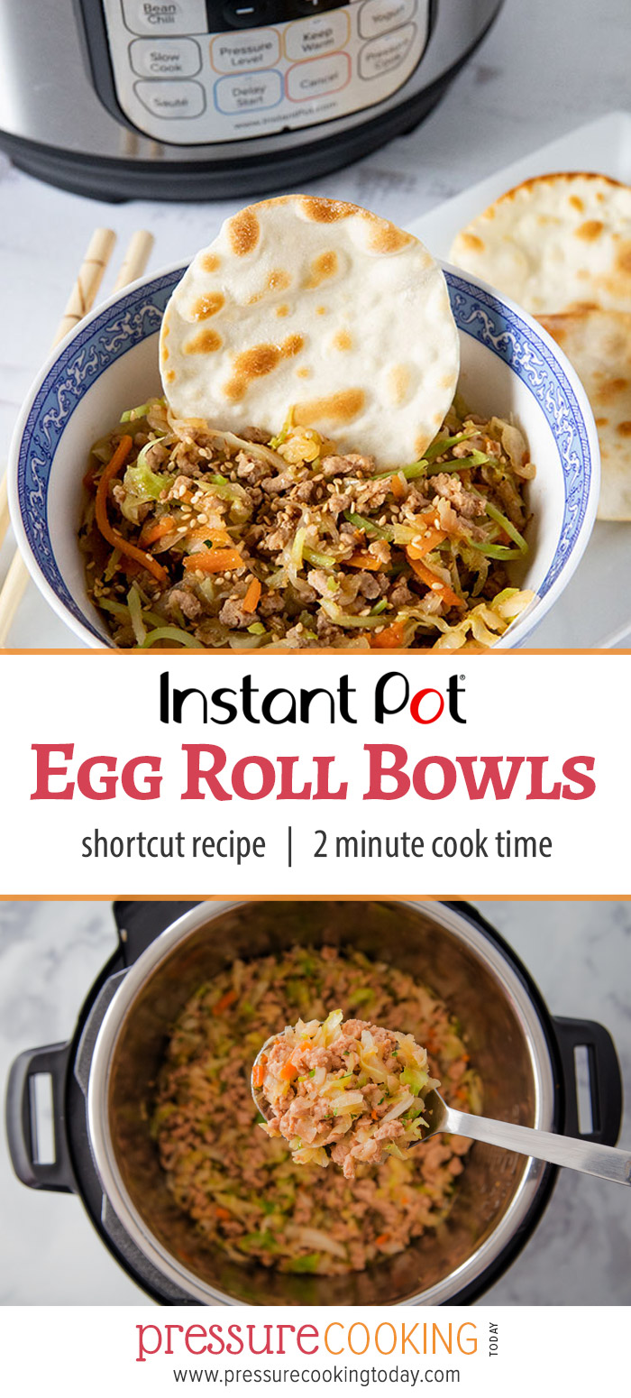 Pressure Cooker / Instant Pot Egg Roll Bowls give you all the flavor of an egg roll in an easy-to-make, easy-to-serve bowl. Since the cabbage and carrots come preshredded and ready to go, you can have a tasty, low carb meal on the table in under 30 minutes!