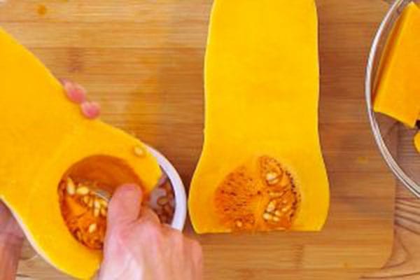 With it’s slender figure and not too hard to cut flesh, butternut squash makes a fine specimen for making a fruit butter. The seeds and stringy flesh come away easily with a spoon.