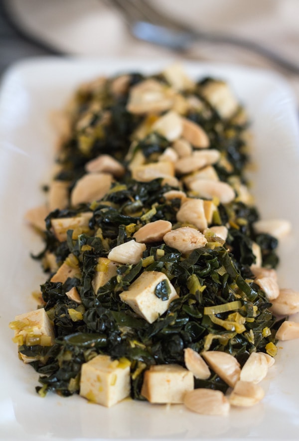 Kale with baked tofu and Spanish almonds is a healthy pressure cooker recipe, perfect for a meatless main meal or side dish. Here, thin Italian kale and leek ribbons are seasoned with sweet paprika, tossed with protein-rich tofu, and finished with chopped salted almonds. This Instant Pot kale recipe will give you a daily dose of healthy greens.