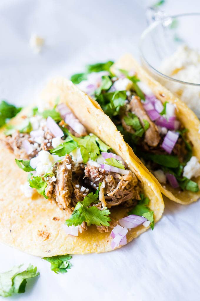 My husband and I live in Austin, TX and pretty much live off of tacos for breakfast, lunch and dinner! The classic ATX lunch taco is sheer perfection and in its’ most pure form consists of a tender shredded meat, some sort of sauce or salsa, and is usually topped with queso fresco, cilantro, and onions. This shredded green chile pork is my go-to when I’m trying to recreate the street taco experience.
